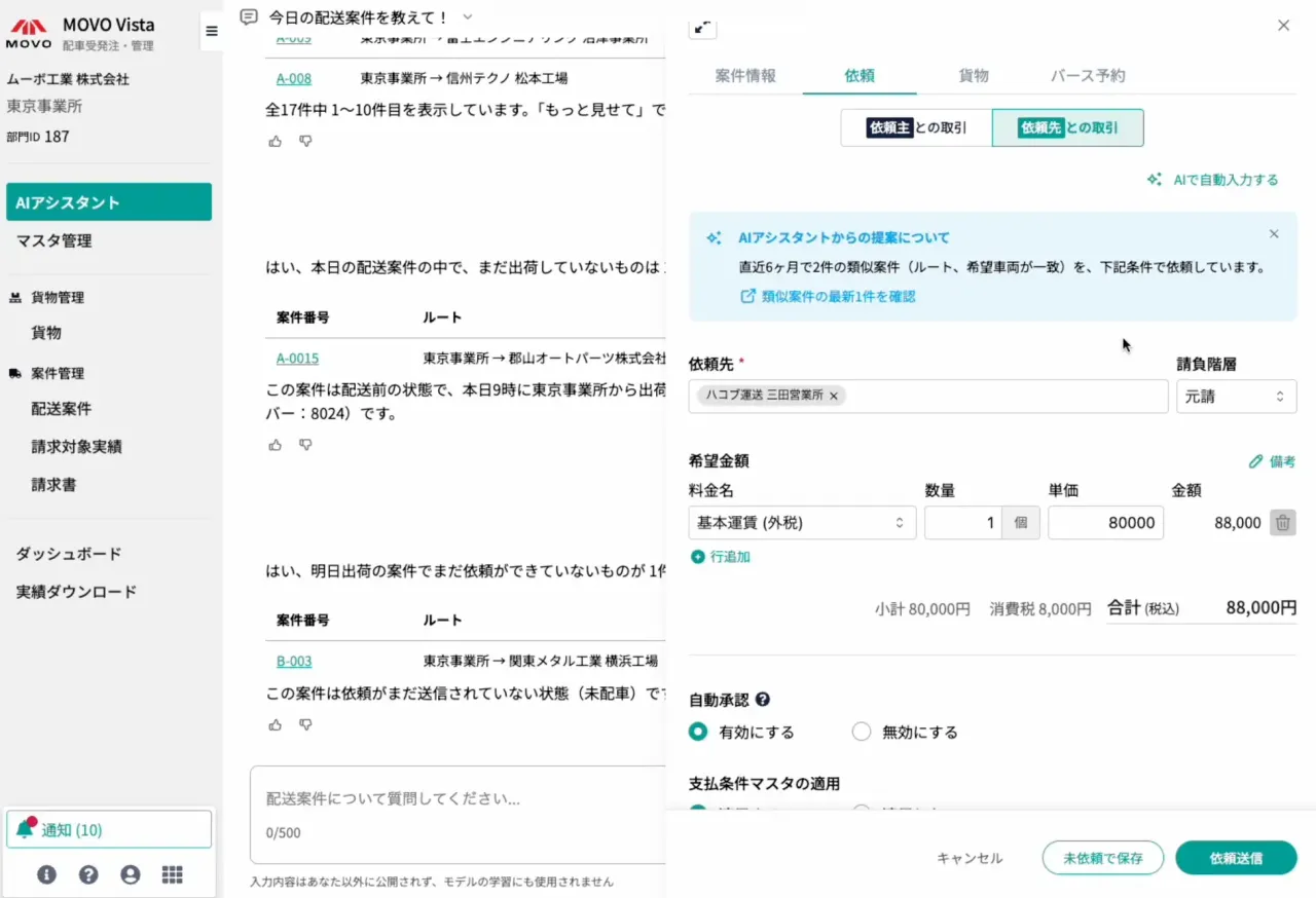 2026年2月26日、クラウド物流管理ソリューションを展開する株式会社Hacobuは、配車受発注・管理サービス「MOVO Vista」において、AIアシスタント機能の提供を開始したと発表した。