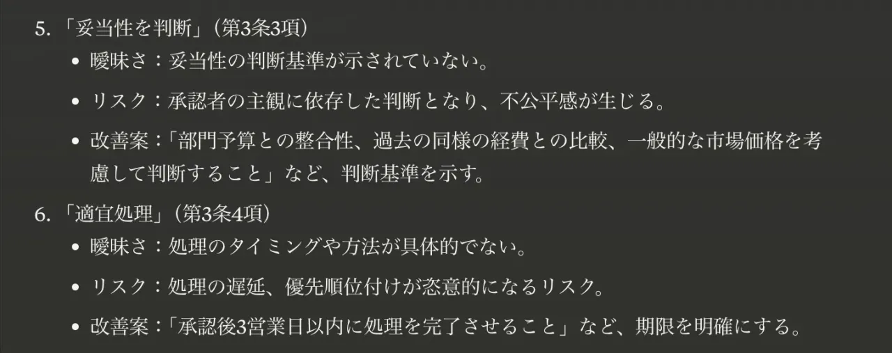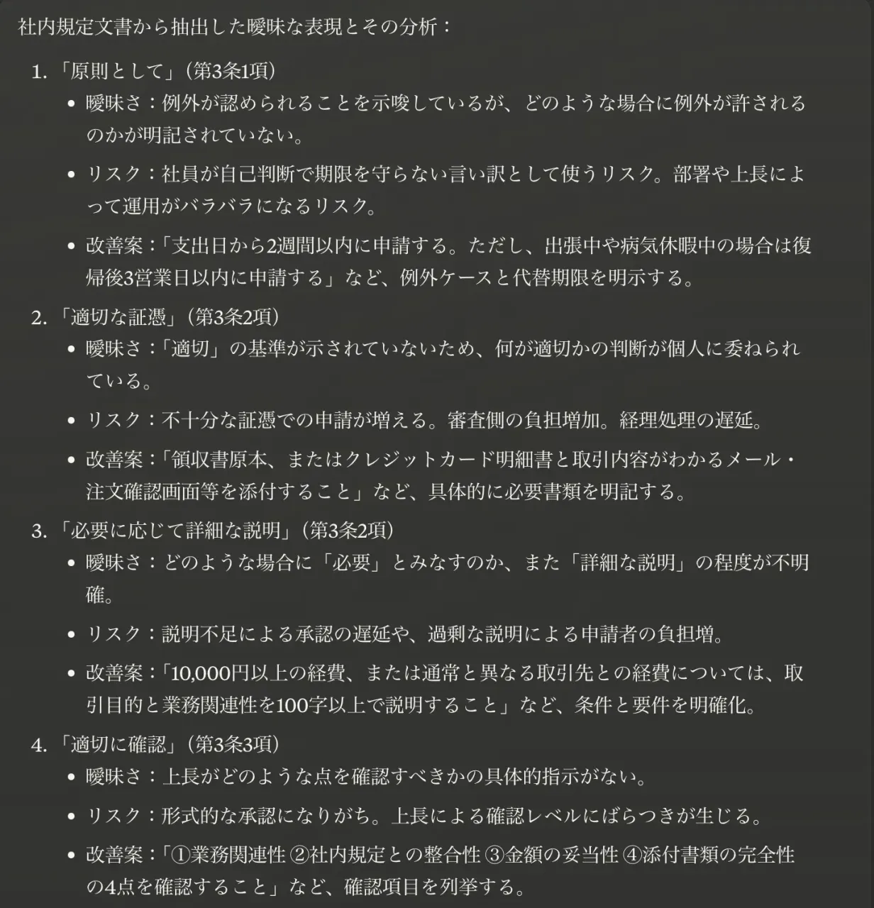 このアプローチにより、従来は膨大な時間と労力を要していた規定文書の改善作業を、質を高めながら効率化することが可能です。特に、曖昧な表現の特定と具体的な代替案の生成というAIの得意分野を活用することで、より実用的な規定文書を作成できます。