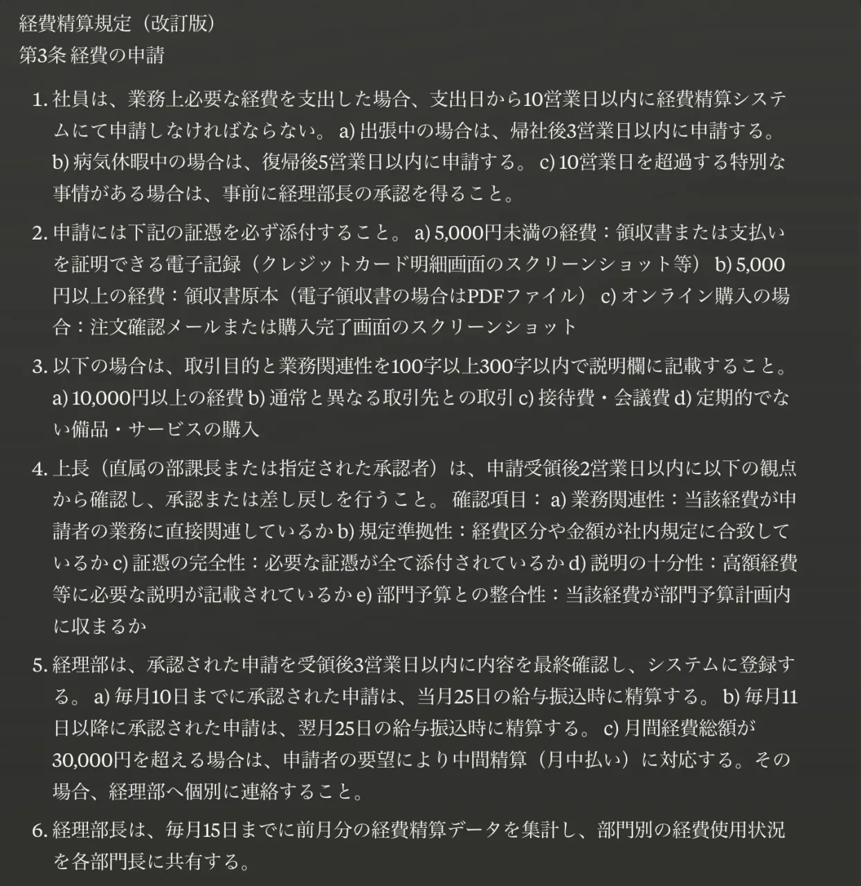 1. 社員は、業務上必要な経費を支出した場合、原則として支出日から2週間以内に経費精算システムにて申請するものとする。