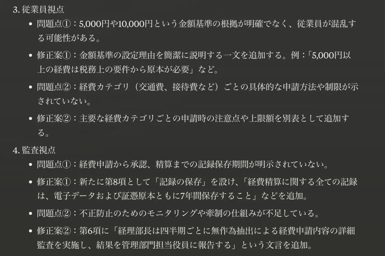改訂した経費精算規定について、以下の視点から問題がないかチェックしてください。