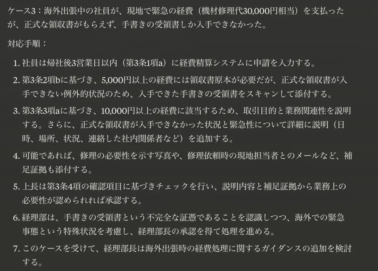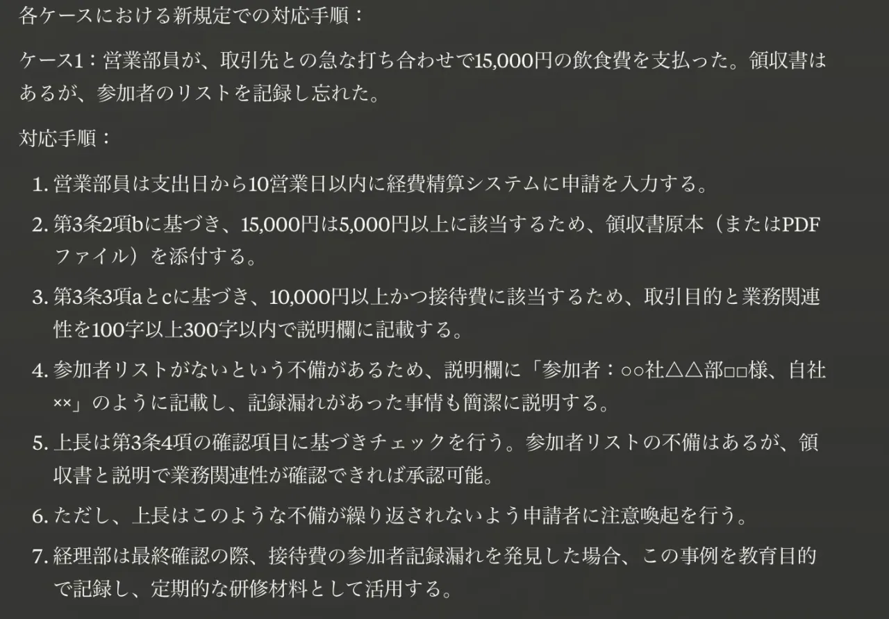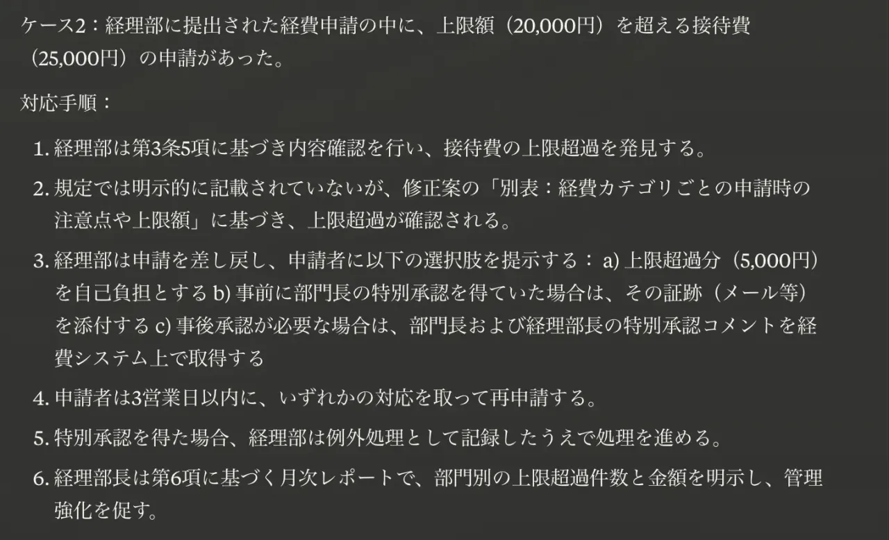 新しい規定文書が実際に機能するかを確認するため、仮想的なシナリオを用いたテストをAIに依頼してみましょう。