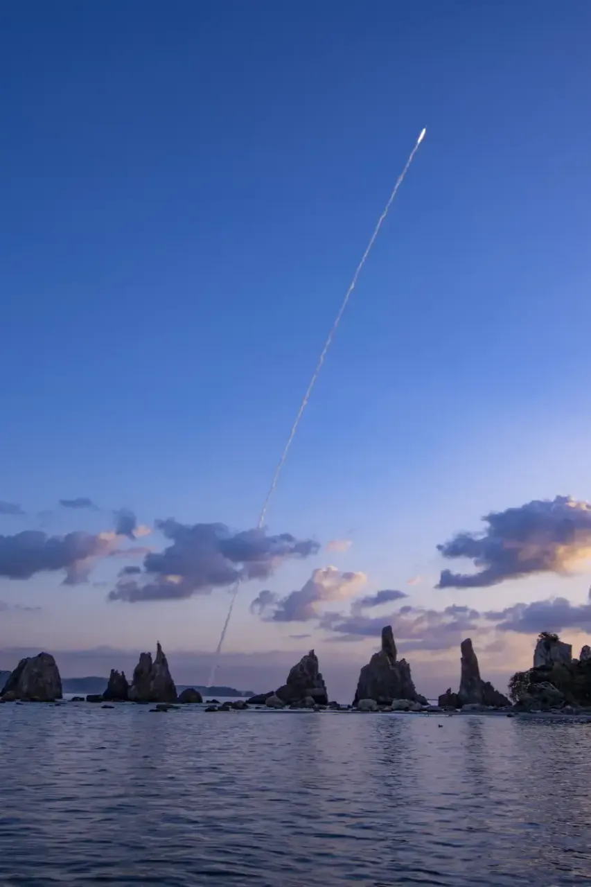 橋杭岩から見た打ち上げイメージ。スペースポート紀伊では、スペースワン株式会社運用のもと、