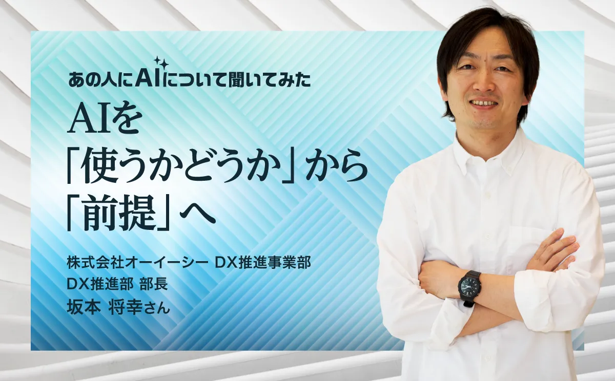 生成AIが仕事の前提になりつつある今、働く現場にも大きな変化が起こっている。本連載では、一人ひとりの頭の中にあるAIについての見解や具体的な活用術を紐解くことで、「AIに聞いても教えてくれない」、人の頭の中にあるAI活用のヒントを探る。今回は、株式会社オーイーシーでDX推進を担い、社内のAI活用の推進も牽引する坂本将幸さんに話を聞いた。AI活用を進める中で見えてきた、つまずきやすいポイント、現場の空気が変わった転換点、そして「完璧を求めない」という実践的な考え方とは⁉(AI Base編集部)