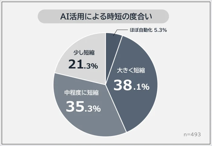 また、時短の度合いについても「大きく短縮された」と答えた人が約4割に達している点は興味深い。特に、助成金の申請書類や複雑な報告書のドラフト作成において、これまで1時間かかっていた作業が15分に短縮されたといった事例もあり、AIが提供する「たたき台」の精度の高さが、実務のスピードを加速度的に高めていることが裏付けられた。