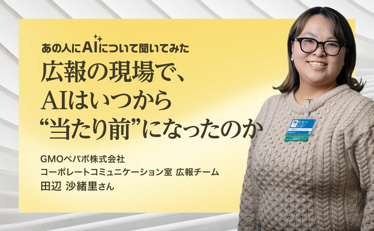 AI活用はもはや一部の専門職に限られたものではない。日々の業務に追われるビジネスパーソンにとって、AIをどう使い、どう付き合うかは現実的なテーマとなりつつある。AI Baseの連載「あの人にAIについて聞いてみた」では、現場で働く一人ひとりの視点からAIとの向き合い方を紐解く。今回は、GMOペパボで広報を担う田辺沙緒里さんに、仕事と生活の両面からAI活用の実感を聞いた。(AI Base編集部)