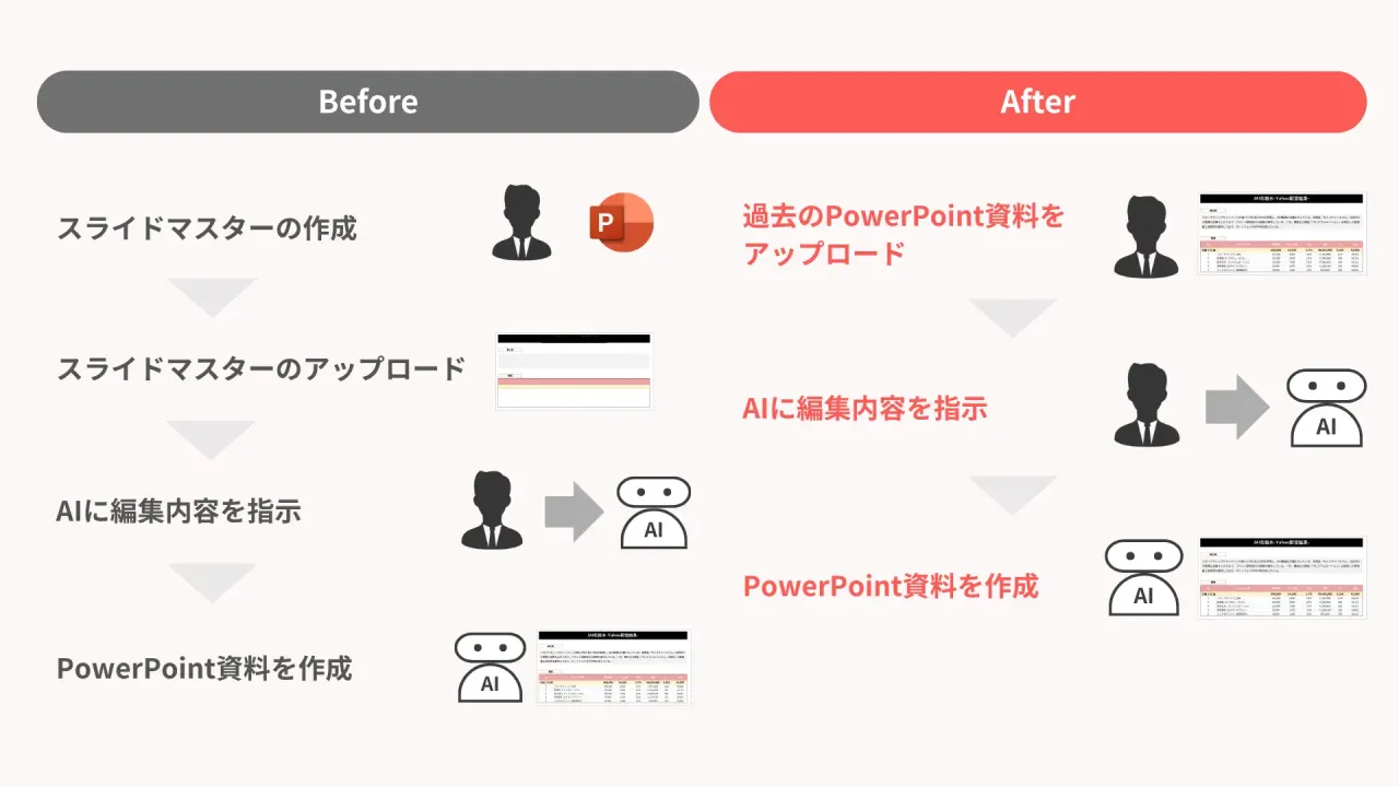 特に現場の負担となっていたのが、スライド全体のレイアウトやフォント、配色を一括管理する「スライドマスター」の取り扱いだ。従来のAI活用においては、新規でスライドを作成するたびに改めてスライドマスターを読み込ませ、崩れた箇所を人間が微調整し直すという手間が残っていた。AIを使っているにもかかわらず、結局は「準備作業の繰り返し」が発生していたのだ。今回の新機能は、この実務上のラストワンマイルを解消するものである。