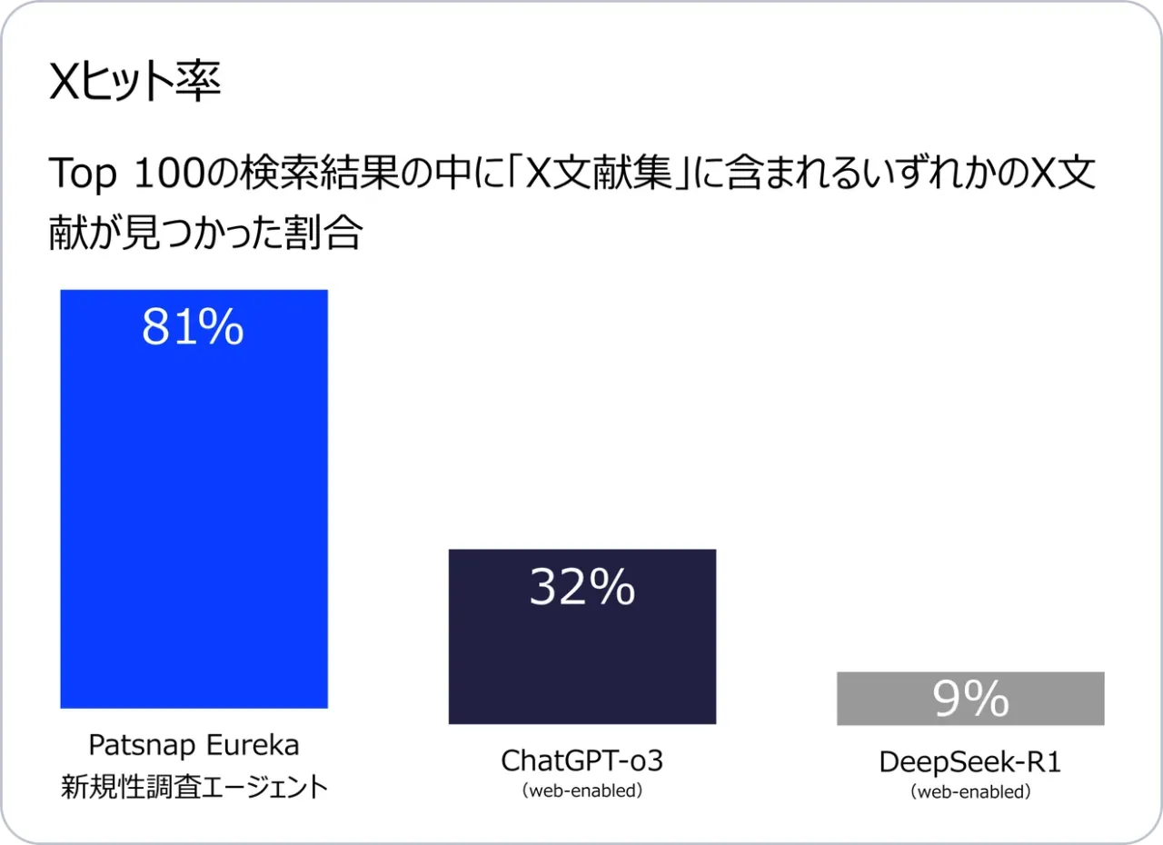 今回実施されたベンチマークテストでは、340件の特許サンプルを対象に、同社の知財特化型AIエージェント「Patsnap Eureka」と代表的な汎用LLMである「ChatGPT-o3」「DeepSeek-R1」の能力を比較した。その結果、特許審査において拒絶理由となり得る重要な先行技術文献(X文献)を見つけ出す「X検出率」において、「Patsnap Eureka」は81%という高い数値を記録。汎用モデルと比較して圧倒的な精度を叩き出した。