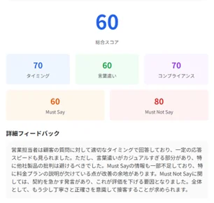 そして最も重要なのが、対話内容をAIが自動で解析し点数化する機能である。「顧客が求める情報を提供できたか」という営業的なスキルはもちろん、「消費者に不安を与える表現はないか」「関連法令に照らしてリスクのある発言をしていないか」といったコンプライアンスの観点からも厳しくチェックが入る。これにより、従来は「なんとなく良さそう」という指導者の主観で評価されていた販売トークが、明確な根拠に基づく客観的なデータとして可視化される仕組みだ。