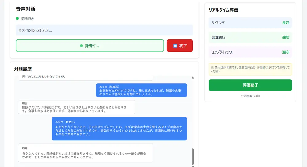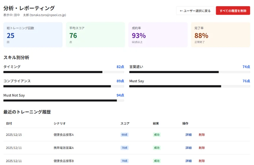 そして最も重要なのが、対話内容をAIが自動で解析し点数化する機能である。「顧客が求める情報を提供できたか」という営業的なスキルはもちろん、「消費者に不安を与える表現はないか」「関連法令に照らしてリスクのある発言をしていないか」といったコンプライアンスの観点からも厳しくチェックが入る。これにより、従来は「なんとなく良さそう」という指導者の主観で評価されていた販売トークが、明確な根拠に基づく客観的なデータとして可視化される仕組みだ。