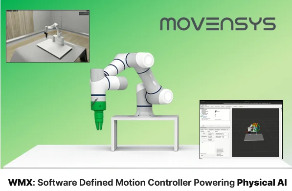モベンシスが「Smart Factory・Automation World 2026(AW 2026)」で公開したのは、フィジカルAI実現の鍵を握るリアルタイム実行インフラだ。中核となるのは、ソフトウェアベースのモーションコントローラ「WMX」である。従来の産業機械が、専用ハードウェアであるPLC(プログラマブル・ロジック・コントローラ)に依存していたのに対し、WMXは汎用的なPCのCPU上で最大128軸の高精度な同期制御を可能にする。