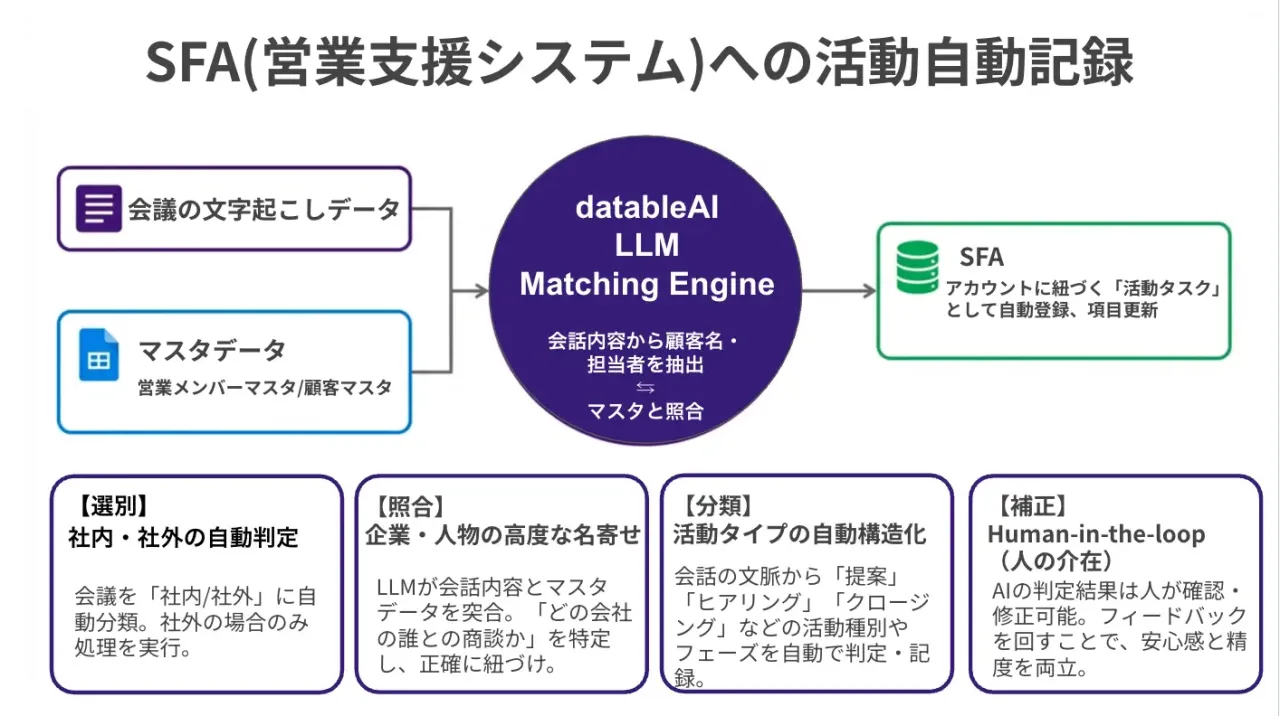 多くのAIベンダーは「こんなに綺麗な要約が作れます」と機能の優秀さをアピールする。しかし、いくら要約が美しくても、それが既存の業務システムとシームレスに連携していなければ、結局人間が手作業で修正する羽目になる。Datableが優れていたのは、「議事録を作った後、営業は何をするのか?」という業務のフローから逆算してシステムを設計した点だ。現場の営業担当に「1秒も無駄な作業をさせない」という徹底した現場視点が、高い利用定着率を生み出している。