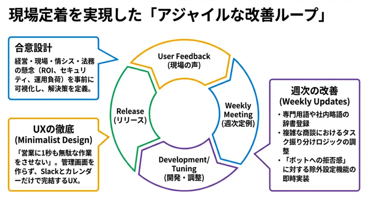 さらに特筆すべきは、開発に入る前に約2週間をかけて行われた「合意設計」のプロセスである。AI導入においては必ず、経営層からの「投資対効果はどうなのか」、情報システム部門からの「セキュリティは安全か」、法務部門からの「録音データの扱いは問題ないか」といった多方面からの懸念が噴出する。この利害調整を後回しにして見切り発車すれば、必ず後からプロジェクトが頓挫する。Datableはこれらの懸念事項を事前にすべてテーブルに並べ、技術的な解決策を一つひとつ提示することで、関係者全員が納得して前に進める状態を構築した。