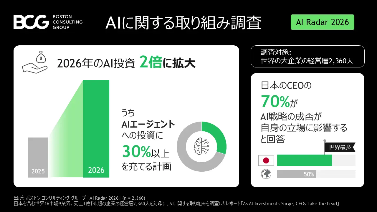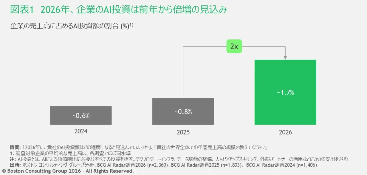BCGが世界16市場の経営層2,360人を対象に実施した調査によれば、企業は2026年にAI投資を倍増させる計画だ。その規模は平均して売上高の約1.7%に達し、テック企業や金融機関においては約2%という高水準にまで引き上げられる。