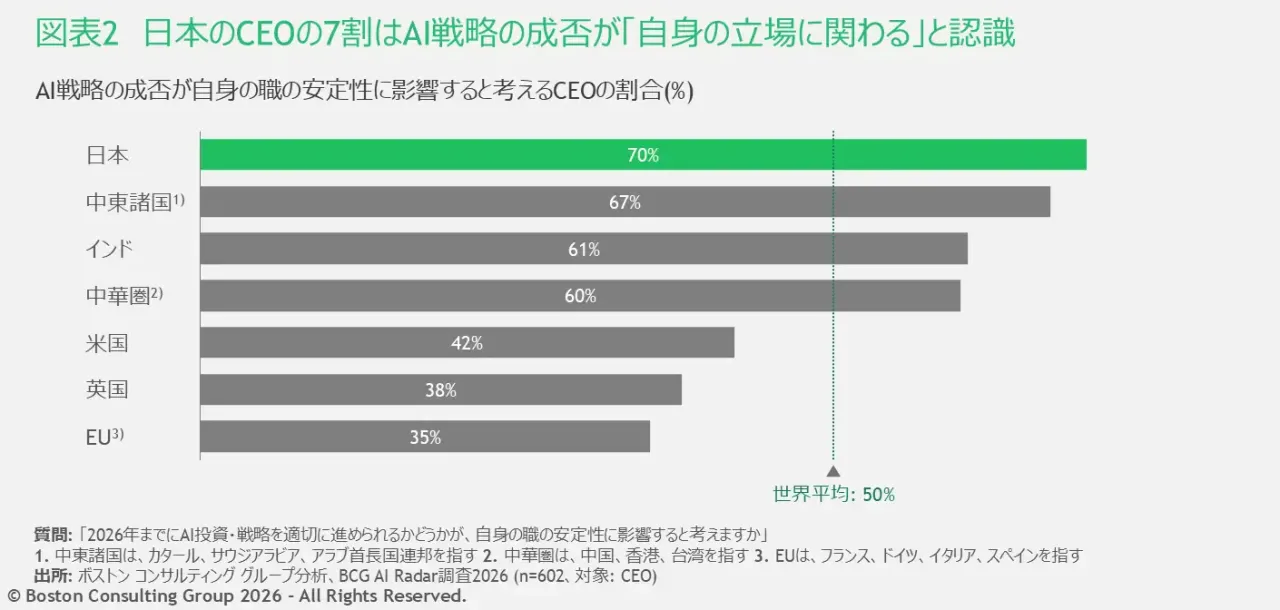 日本のトップ層は、AIを単なる現場のDXテーマとしてではなく、自らのリーダーシップと進退を懸けた「経営の核心」として捉えていることが分かる。