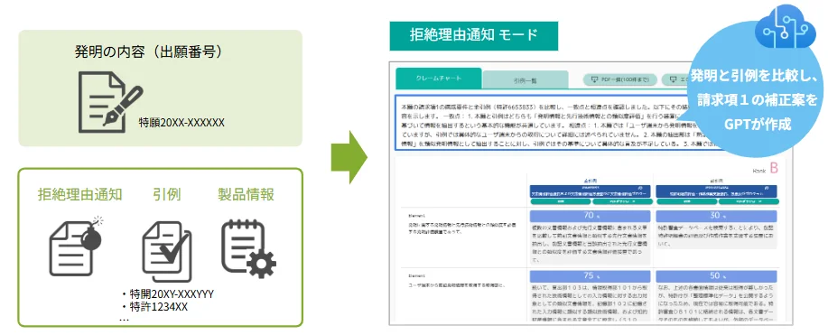 具体的には、出願番号と拒絶理由通知、および引例を入力するだけで、発明と引例の一致点や相違点をAIが自動的に比較し、分析結果を「クレームチャート」として出力する。さらに、その分析に基づいて生成AIが特許請求項の補正案を即座に提案。併せて実装された「IDEA BOX」機能を用いれば、作成済みの意見書などをアップロードすることで、その形式に合わせた書類のドラフトをシームレスに作成できる。