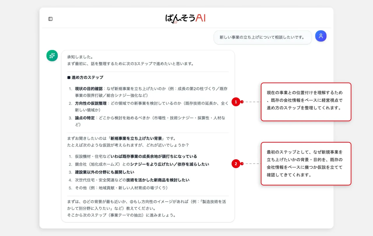 利用者が課題を相談すると、AIはいきなり解決策を提示せず、「なぜ今その施策が必要なのか」「既存事業とどう連携させるか」といった問いを重ねる。この対話プロセスにより、経営者自身が課題の本質を整理し、自律的に解を導き出せるようサポートする。