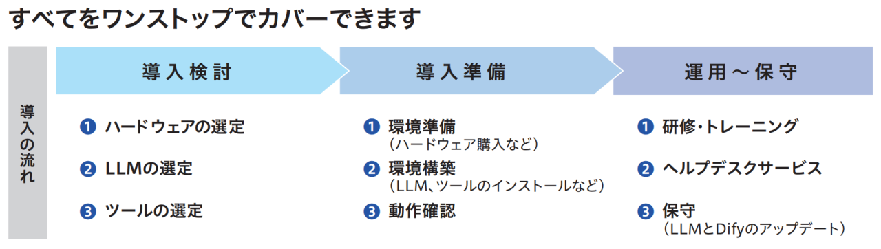 ●導入前の課題整理から環境構築、研修、保守までAI開発のエキスパートが伴走し、生成AIの定着化をサポートします。